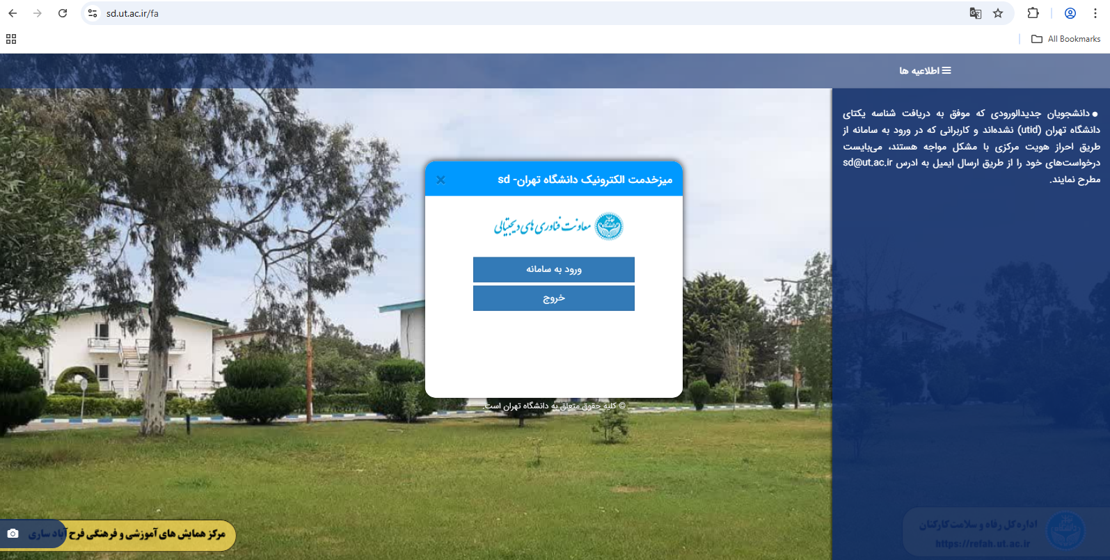 نکته: دانشجویان جدیدالورودی که موفق به دریافت شناسه یکتای دانشگاه تهران (utid) نشدهاند و کاربرانی که در ورود به سامانه از طریق احراز هویت مرکزی با مشکل مواجه هستند، میبایست درخواستهای خود را از طریق ارسال ایمیل به آدرس sd@ut.ac.ir مطرح نمایند.