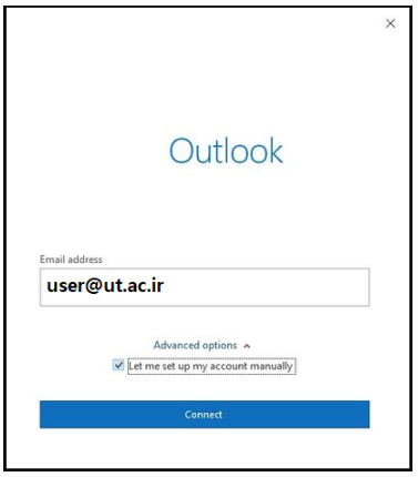پس از اجرای برنامه مطابق شکل آدرس ایمیل خود را وارد کنیم. روی Advance options کلیک و گزینه let me set up my account manually را انتخاب کنیم و در انتها دکمه Connect را کلیک میکنیم.