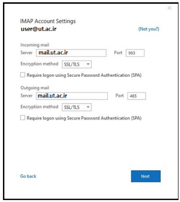 تنظیمات را برای IMAP به صورت زیر انجام میدهیم و دکمه next را کلیک میکنیم.