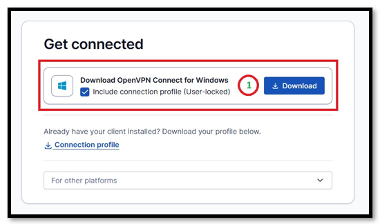 الف - اگر اپلیکیشن OpenVPN Connect را ندارید بهتر است با کلیک بر روی گزینه Download در بخش ۱ تصویر، نسخه ویندوز اپلیکیشن را دانلود نمایید.