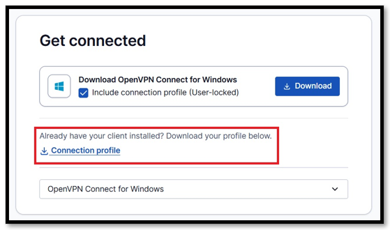 ج- در مرحله سوم نیاز است فایل کانفیگ را دانلود نمایید. برای اینکار بر روی گزینه Connection profile کلیک کنید تا فایل کانفیگ دانلود شود.