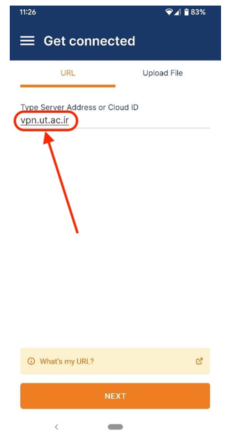 ۲- بعد از نصب برنامه و اجرای آن، در قسمت بالا آدرس vpn.ut.ac.ir را به دقت وارد کنید. سپس دکمه NEXT را در پایین صفحه فشار دهید.