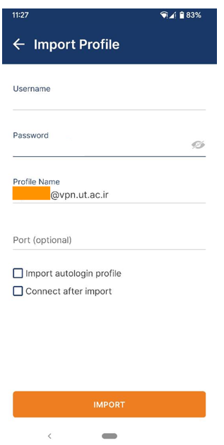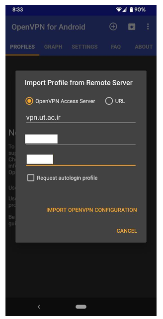 ۳- مطمئن باشید گزینه OpenVPN Access Server انتخاب شده باشد. در قسمت اول (AS servername) آدرس vpn.ut.ac.ir را به دقت وارد کنید. در دو قسمت بعد شناسه یکتای دانشگاه و رمز خود را وارد کنید. در نهایت IMPORT OPENVPN CONFIGURATION را انتخاب کنید.