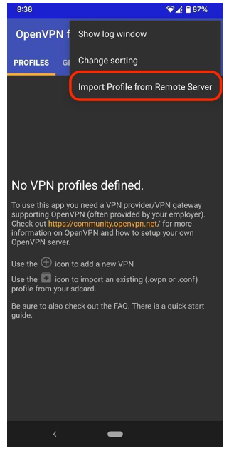 ۲- بعد از نصب برنامه و اجرای آن، روی 3 نقطه در بالا راست صفحه، بزنید و گزینه Import Profile From Remote Server را انتخاب نمایید.